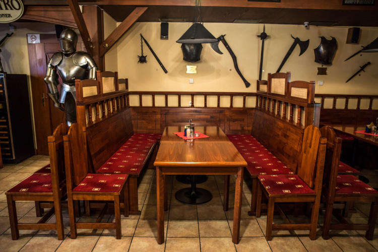 Interiér restaurace v dobovém vyřezávaném stylu, obkládaný dřevem, na stěnách jsou umístěná dobová brnění a středověké ruční zbraně.