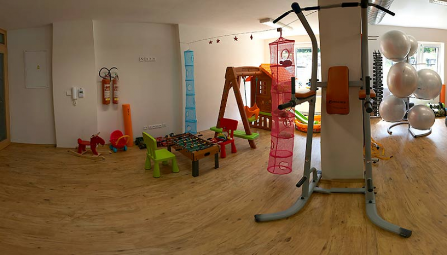 Tělocvična je spojena s dětským koutkem, můžete si zde zacvičit i s Vašimi dětmi.