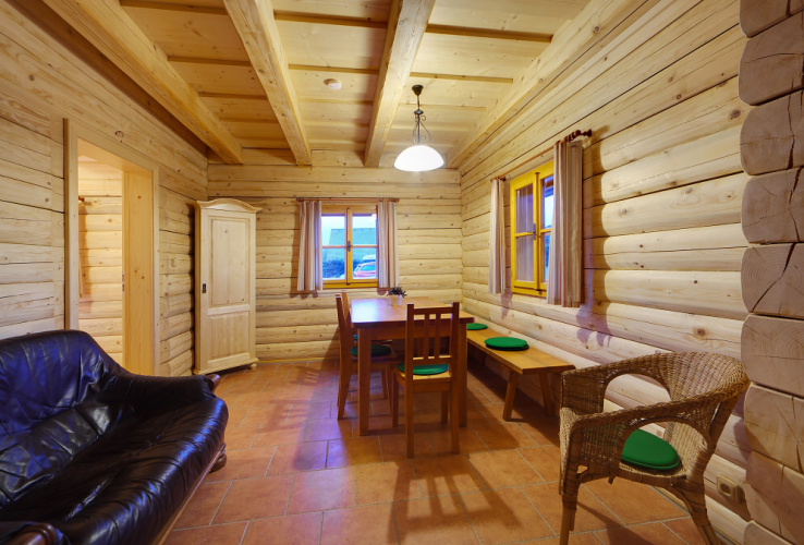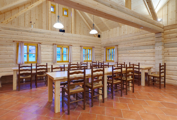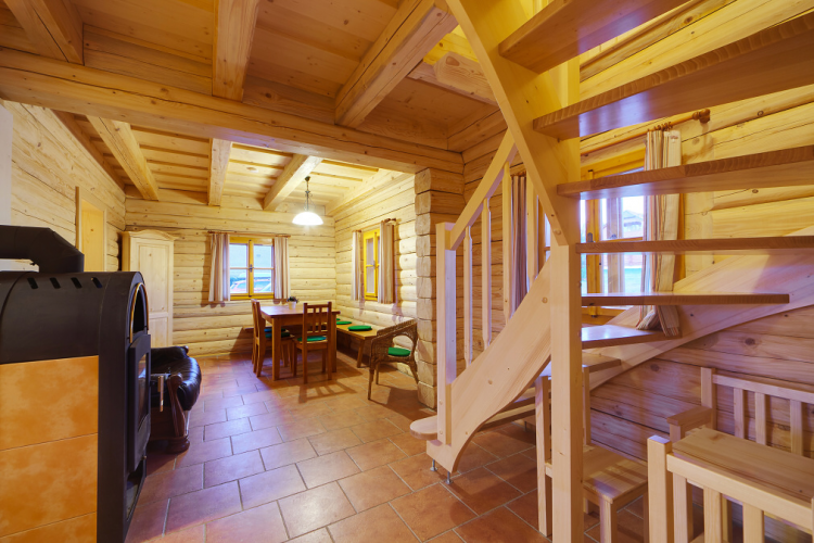 Dvě roubené chalupy jsou spojeny velkou společenskou místností, tudíž