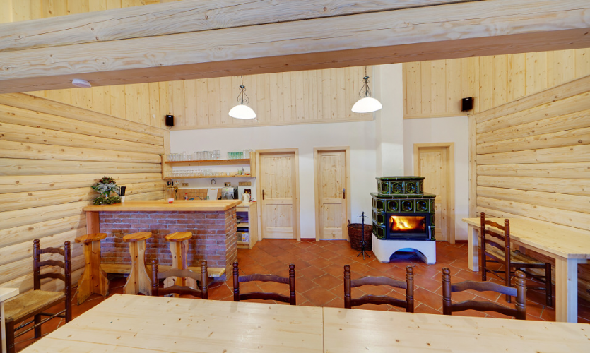 Příjemnou atmosféru umocňují krbová kachlová kamna a bar.