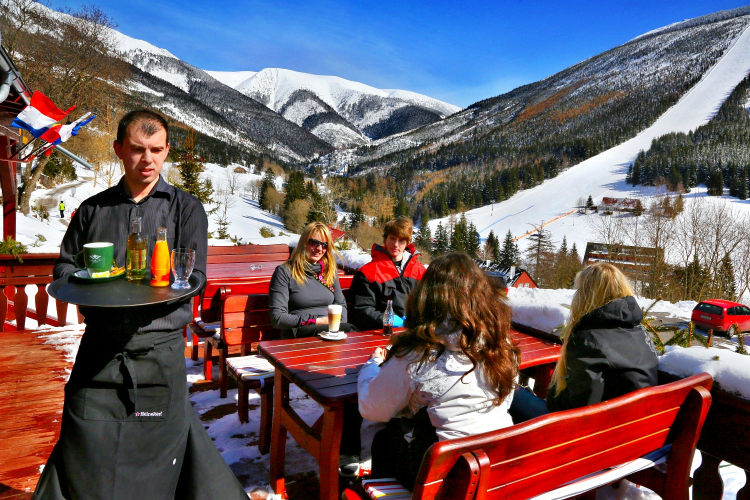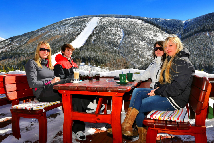 s překrásným výhledem na Kozí hřbety a sjezdové tratě.