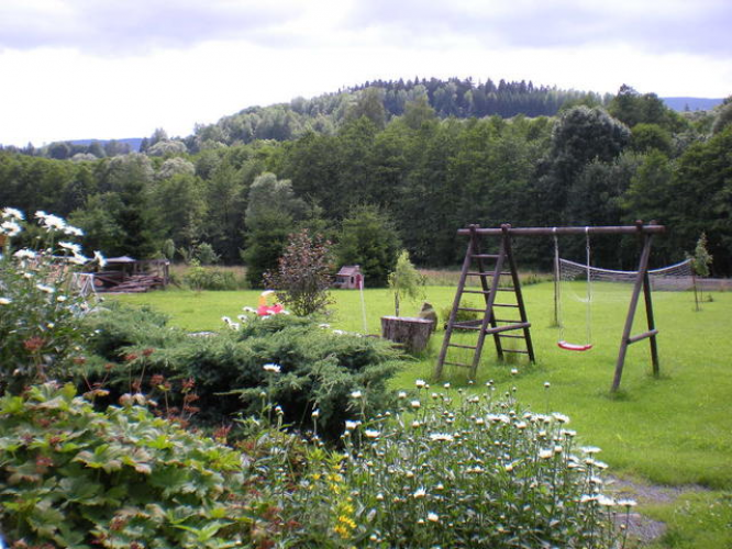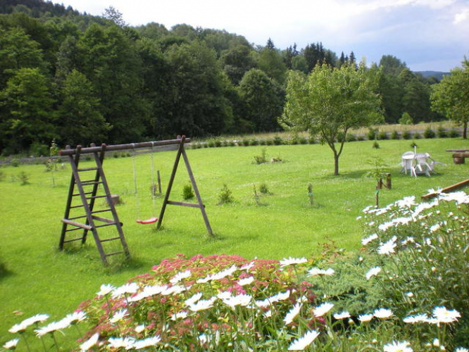 slunci, ve stínu stromů a taky u potoka. Pro děti je na zahradě -