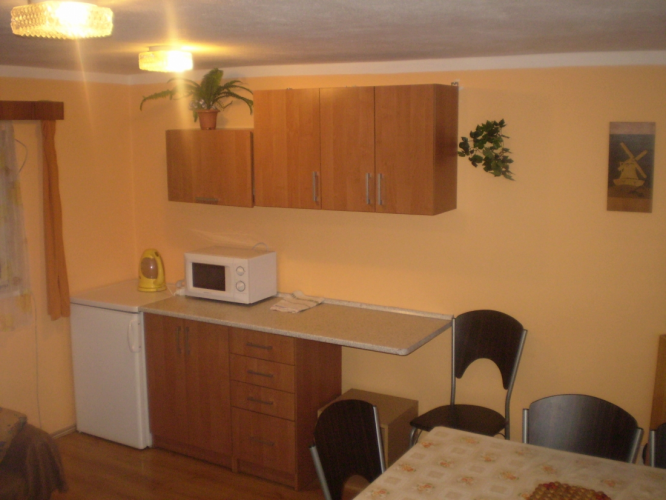 spojenou s obývacím pokojem, vybavenou kuchyňskou linkou, mikrovlnou