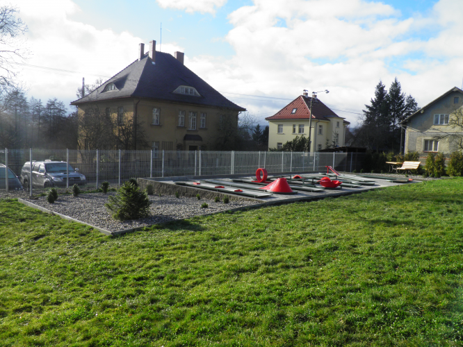 | Hřiště | pískoviště, stolní tenis, trampolína, houpačka, dřevěný hrad |