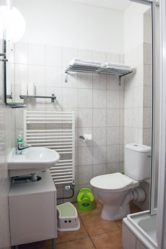 Najdete u nás i přebalovací stůl, nočník, dětské sedátko a stupátko, aby vaše dítko dobře dosáhlo na umyvadlo.